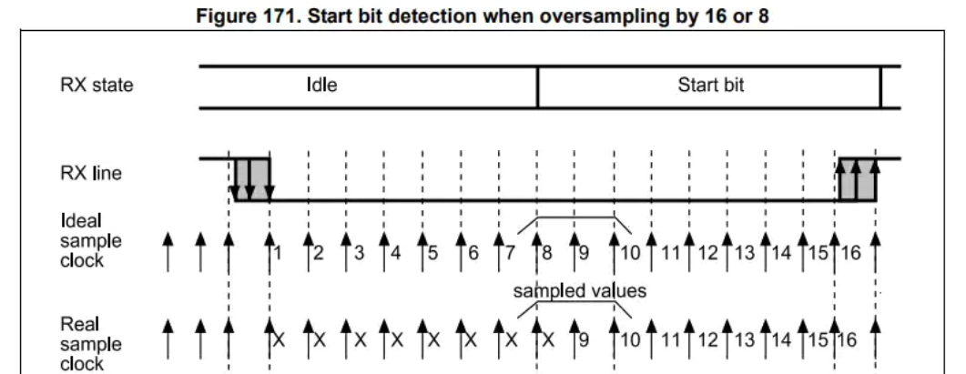 - 수신기(UART Rx)는 라인이 낮은 상태(START 비트)를 16번 중 8번 이상 검출하면 시작 비트로 인식