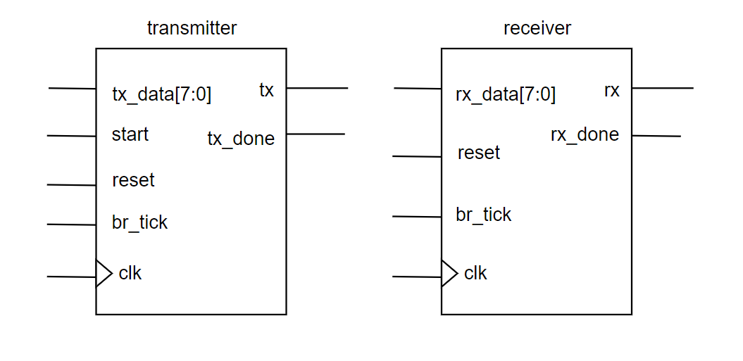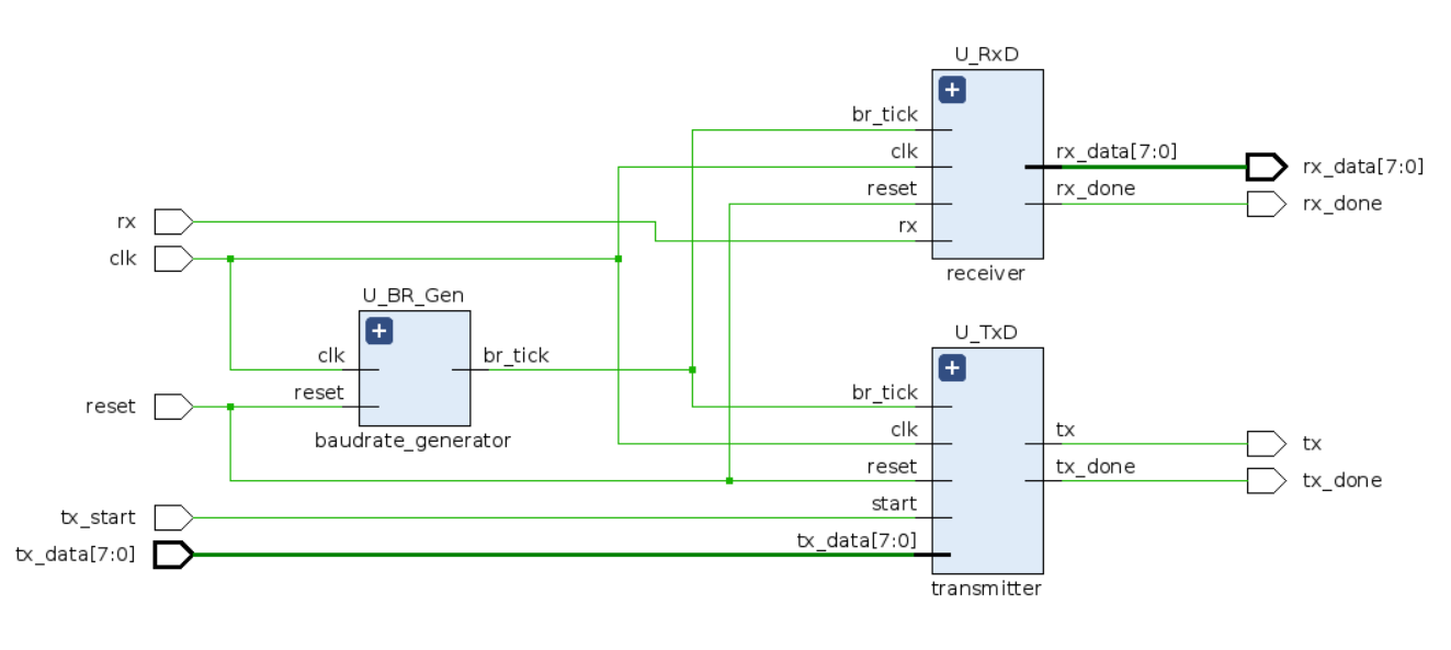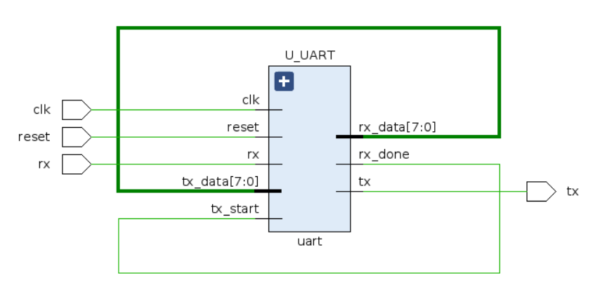 - receiver를 통해 데이터 처리 후 `rx_data` 8bit를 transmitter의 `tx_data`로 입력