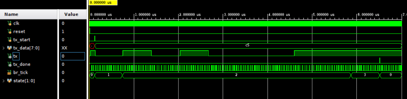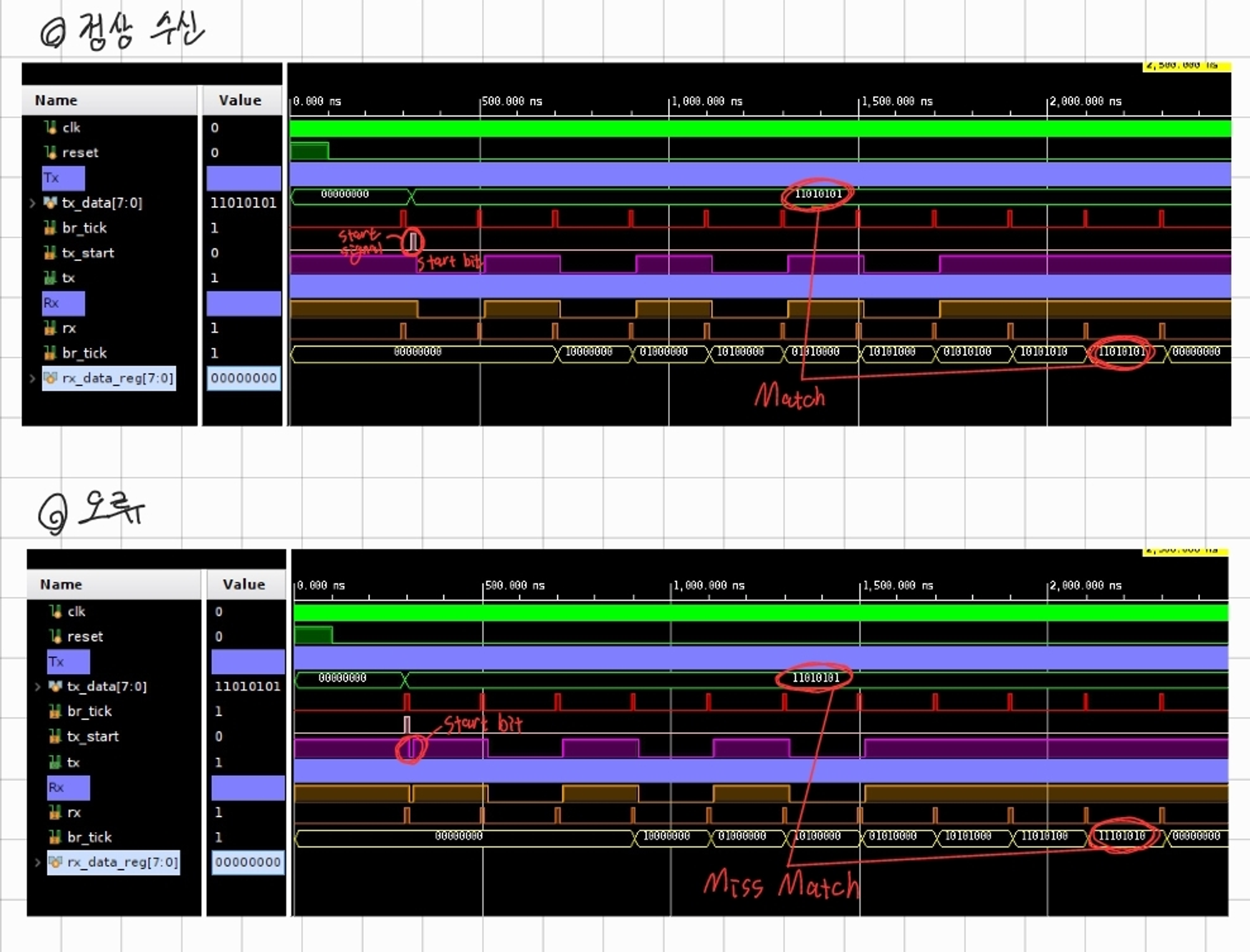 - 위 시뮬레이션 결과와 같이 start bit가 일정 클럭 유지되었을 때는 reciever의 출력이 입력 값과 동일하지만 start bit가 일정 클럭 유지되지 않았을 경우(너무 짧을 경우), 첫번째 수신 비트를 인식하지 못하고 stop bit(High)를 수신 비트로 인식해버려 오류가 생긴다.