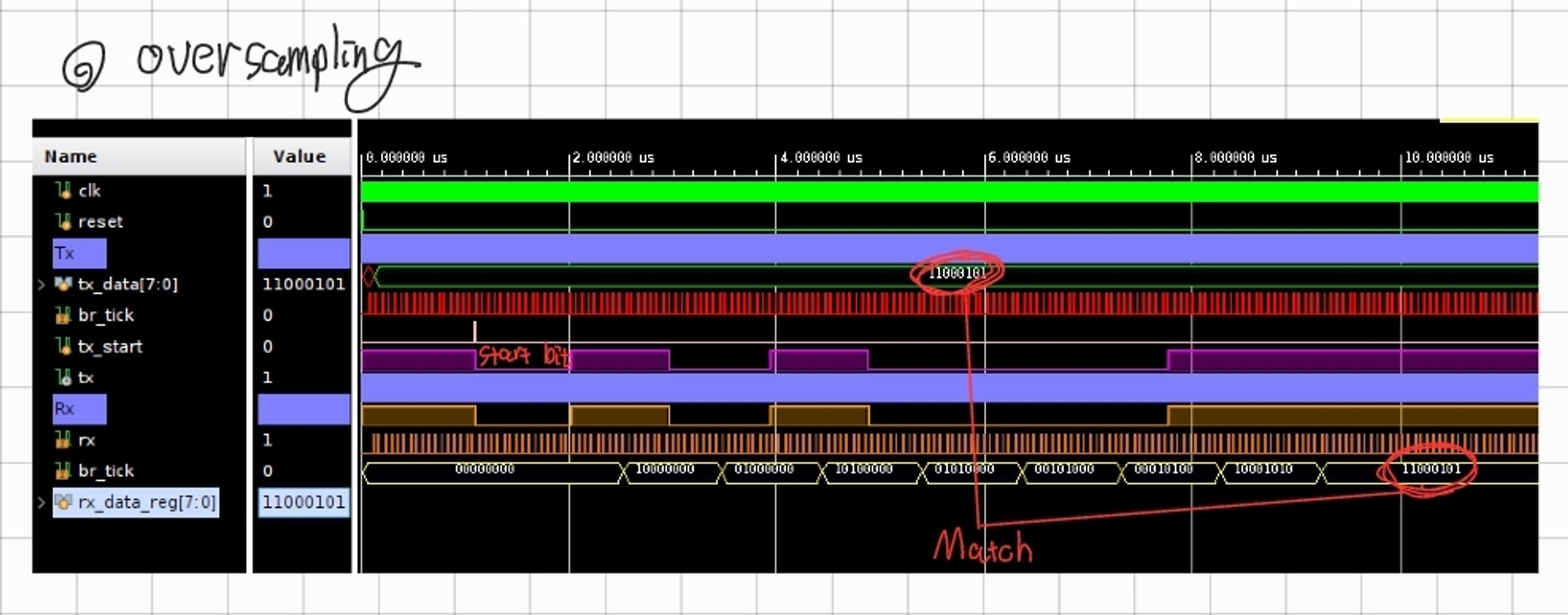 - oversampling을 사용하는 경우 start bit가 무조건 일정 클럭 유지되기 때문에 receiver에서 정상적으로 데이터를 인식한다.