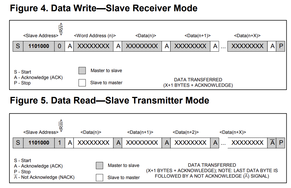 - datasheet에서 Data Write protocol과 같이 Slave Address → Word Address → Data(0) → Data(1) …. 순서로 전송됨