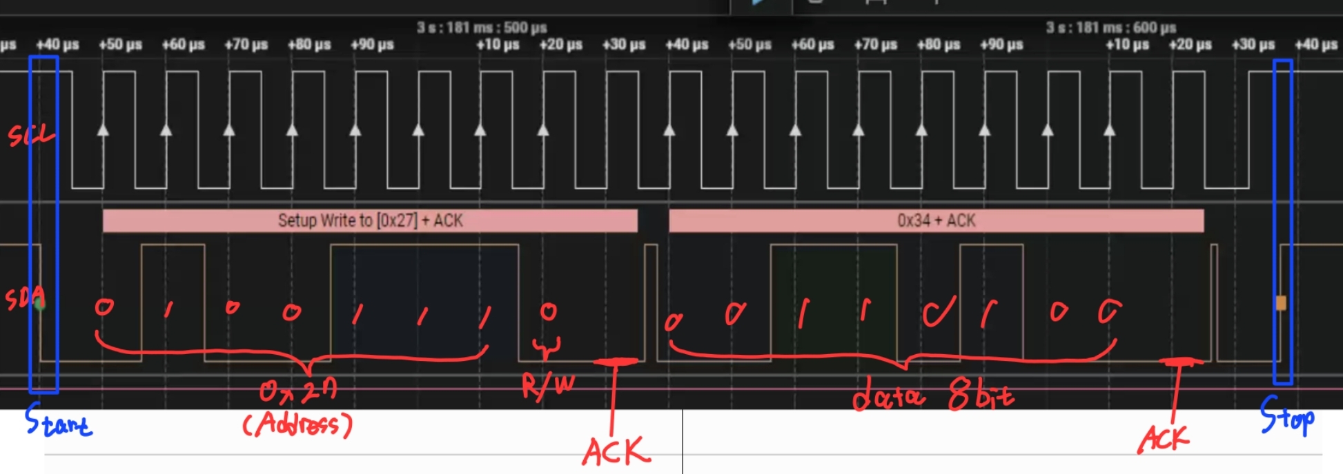 - ACK signal : SCL High & SDA Low (Slave → Master 전송)
