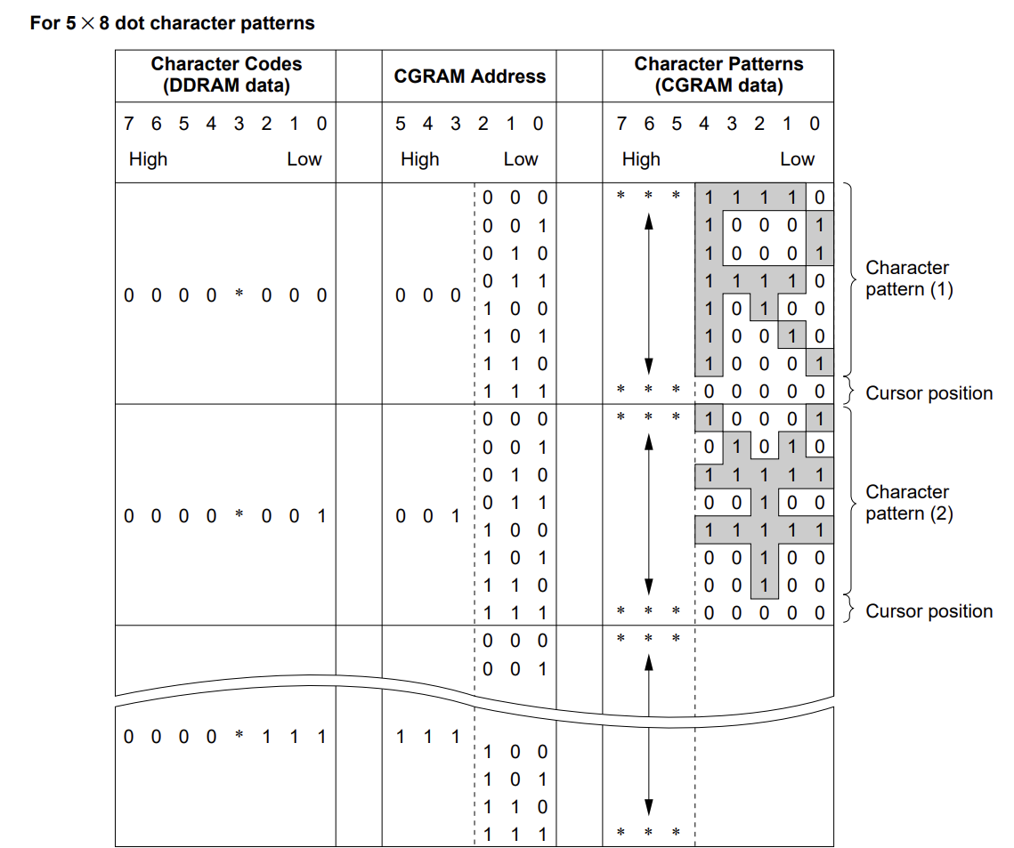 - Character Code 0b0000 0000 ~ 0b0000 1111일 때 CGRAM에 저장된 사용자 정의 문자를 출력 가능