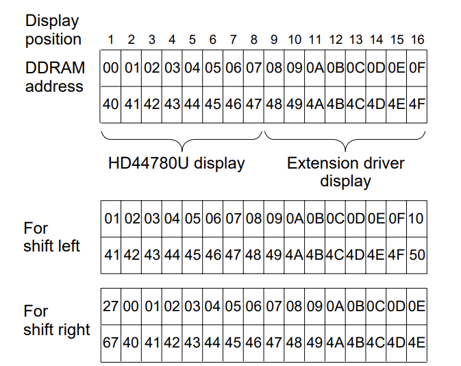 → 위 표와 같이 DDRAM에 저장할 수 있는 문자는 80개이지만 LCD Display가 16x2이기 때문에 32개의 문자만 출력