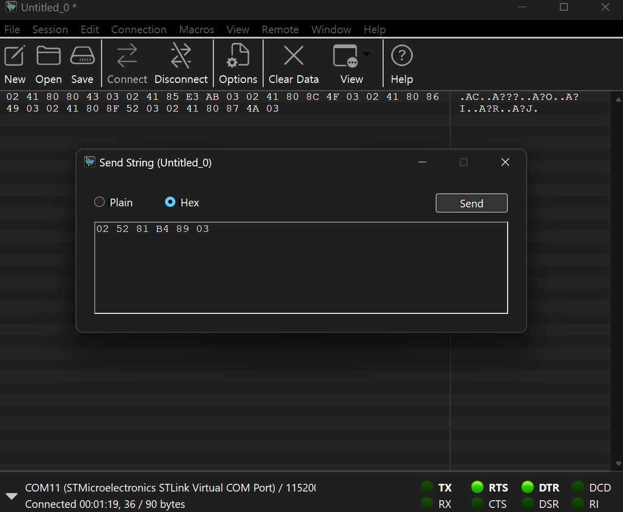 1. 데이터 통신 프로토콜에 따라 버퍼에 데이터 저장 (STX CMD data1 data0 CRC ETX )