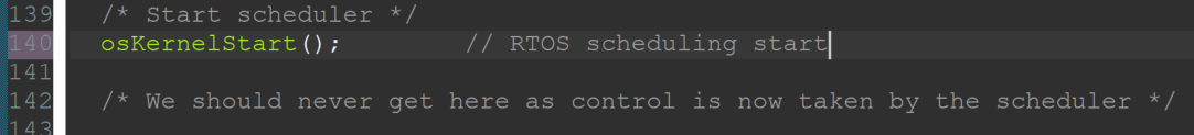 `osKernelStart()` 함수가 실행되면 scheduling이 실행되며 이 아래있는 코드는 실행되지 않음