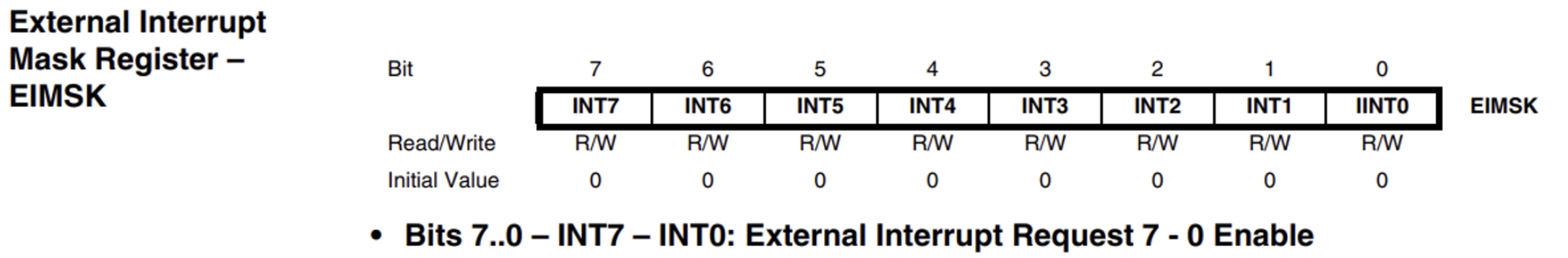 ● EIMSK(External Interrupt Mask Register) : 해당 External Interrupt 활성화(Enable)